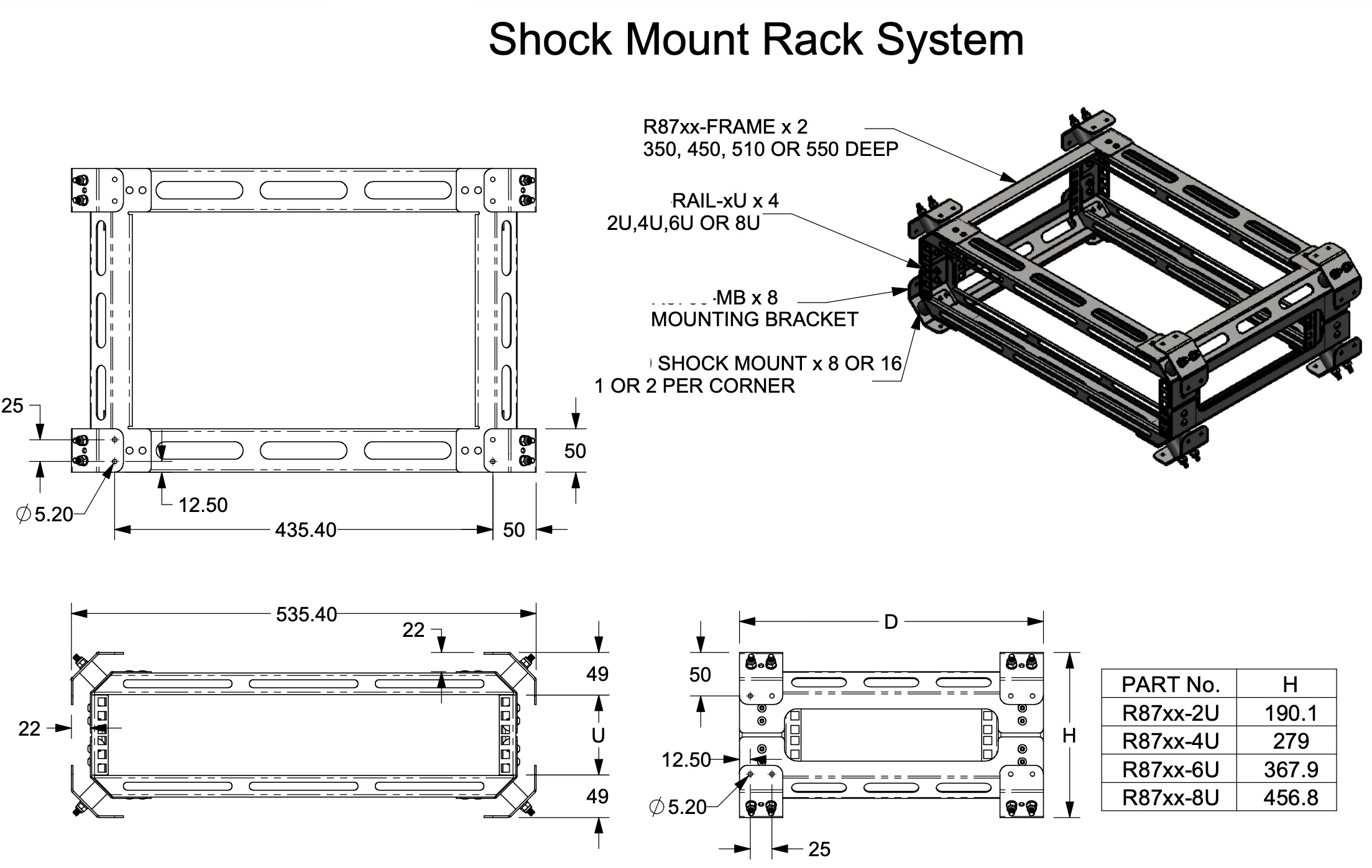 Shock mount (ระบบกันสะเทือน) เป็นโครงสร้างเหล็ก หรือ อลูมิเนียม สำหรับยึดอุปกรณ์ หน้ากว้าง 19 นิ้วมาตรฐาน เช่น Stage box ,power amp เป็นต้น (เมื่อประกอบขึ้นมาตัวแร็คจะกว้างกว่าแร็คมาตรฐานทั่วไป โดยปกติจะกว้าง 52.5 cm แต่เมื่อประกอบ shock mount เข้าไปแล้ว จะกว้าง 60 cm) ถ้าเป็นโครงสร้างเหล็ก จะยึดด้วยน๊อตและแหวนสปริง ส่วนโครงสร้างอลูมิเนียมจะใช้วิธีเชื่อม