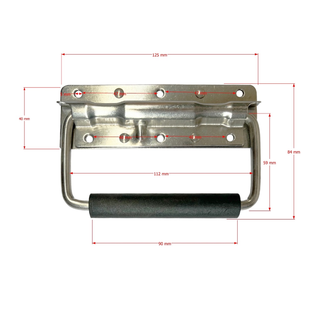 ทำจากเหล็กหนา 1 มม.ปั้มขึ้นรูป ชุบสแตนเลส มียางสวมที่มือจับ เพื่อการจับที่นุ่มนวล ใช้เป็นหูยกกล่อง มีสปริงดีดกลับ วิธีติดตั้งใช้สว่านเบอร์ 5 เจาะนำที่รูของมือจับ แล้วใช้สกรูเกลียวปล่อยขันยึดติดกับตัวกล่อง หรือใช้รีเวทยิงยึดก็ได้ ถ้าจะให้รับน้ำหนักมากขึ้นควรฝังทีนัทด้านในของกล่องบริเวณรูมุมทั้ง 6 ของมือจับ แล้วใช้น๊อต M5 ยึด ความยาวขึ้นอยู่กับความหนาของไม้